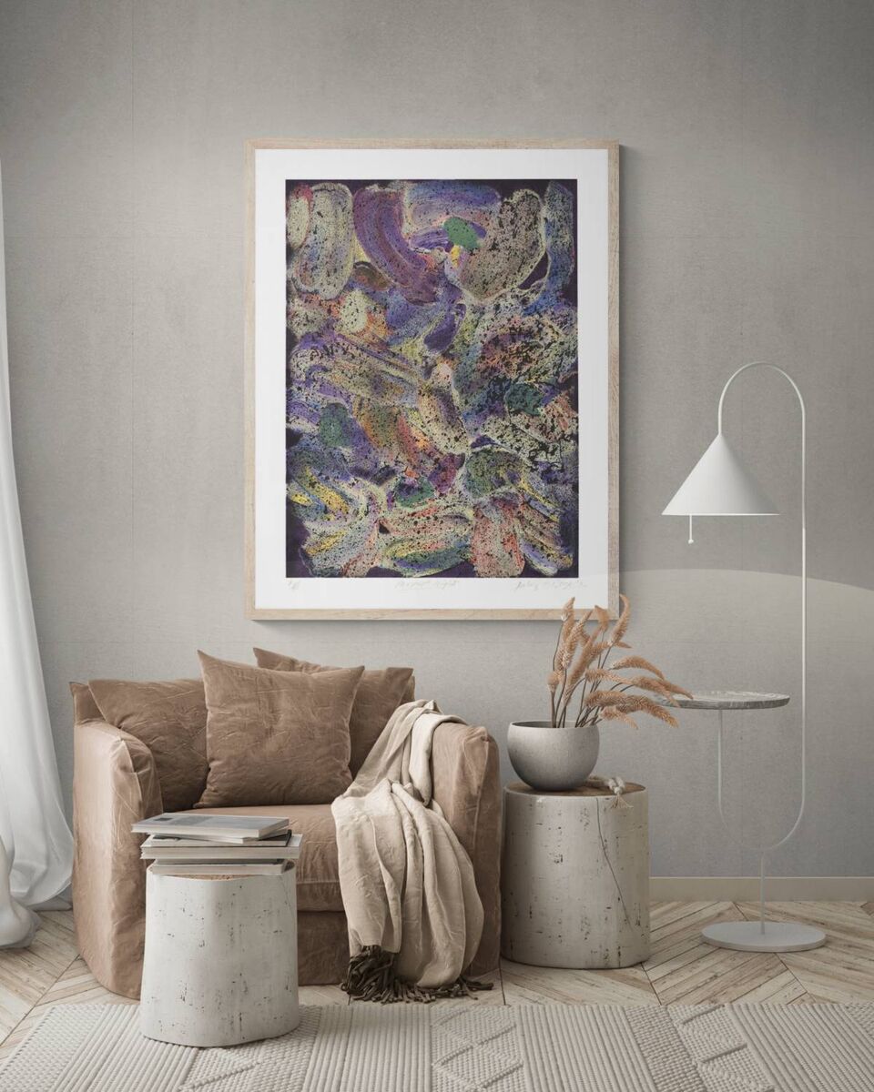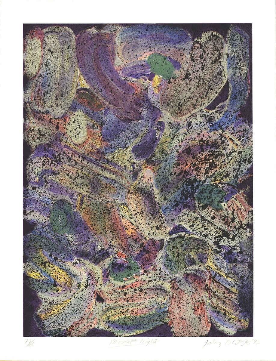 "Mozart Night" by Jules Olitski, Signed Serigraph printed in 1992 from an edition size of 108. The overall size of the Serigraph is 47 x 36 inches. The condition of this piece has been graded as A: Mint. Hand signed, dated, titled and numbered out of 108 in pencil by Olitski.